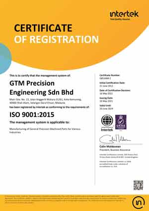 GTM Precision Engineering Sdn Bhd, as a leading manufacturer of machined metal parts. We are certified ISO9001:2015 where the Quality Management System (QMS) apply to our core business activities which are “MANUFACTURING OF GENERAL PRECISION MACHINED PART FOR VARIOUS INDUSTRIES”. The ISO9001:2015 elements apply to all activities including resource management, productions, documents and records control, sales and marketing and quality control of GTM Precision Engineering Sdn Bhd core business.